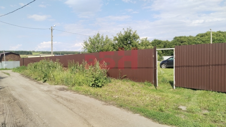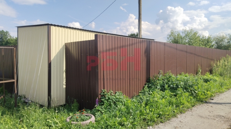 Забор установлен по всему периметру из профнастила . Сейчас поставить такой забор специлистами обойдется около 500 т. р.